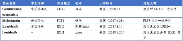 2017年以来,FDA先后批准了诺华Midostaurin、新基/agioses Enasidenib及agioses ivosidenib 等新型AML靶向治疗药物(见下表),为AML患者治疗带来了新的希望 。