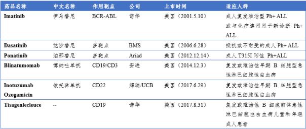 化疗是ALL最主要的治疗方法,靶向治疗是部分具有特殊靶点患者的治疗选择,是近年来新开展的治疗方法 。目前获批药物主要有伊马替尼、达沙替尼、泊那替尼等小分子靶向药物。单抗药物、细胞治疗药物在成人ALL治疗中也取得了显著效果 。